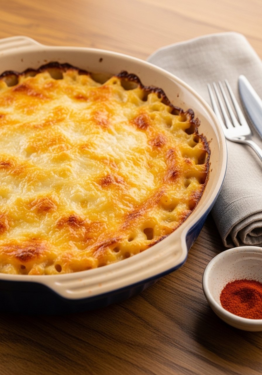 Serve warm with a sprinkle of smoked paprika and chopped parsley. Pair with a simple green salad and chilled white wine or iced tea. Garnish with extra cheddar for presentation. To reheat, microwave covered for 90–120 seconds or oven at 350°F (175°C) for 15–20 minutes. Store leftovers in airtight containers.
