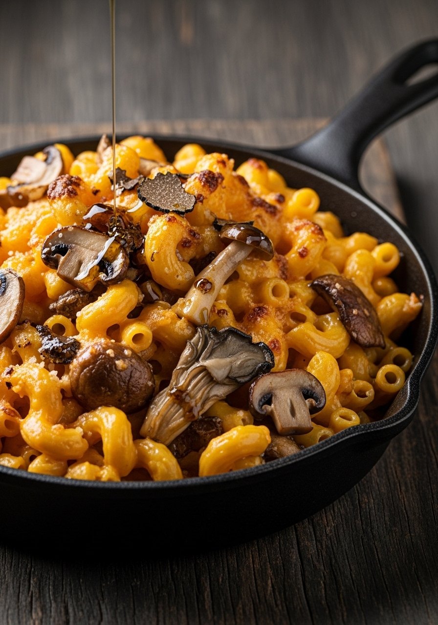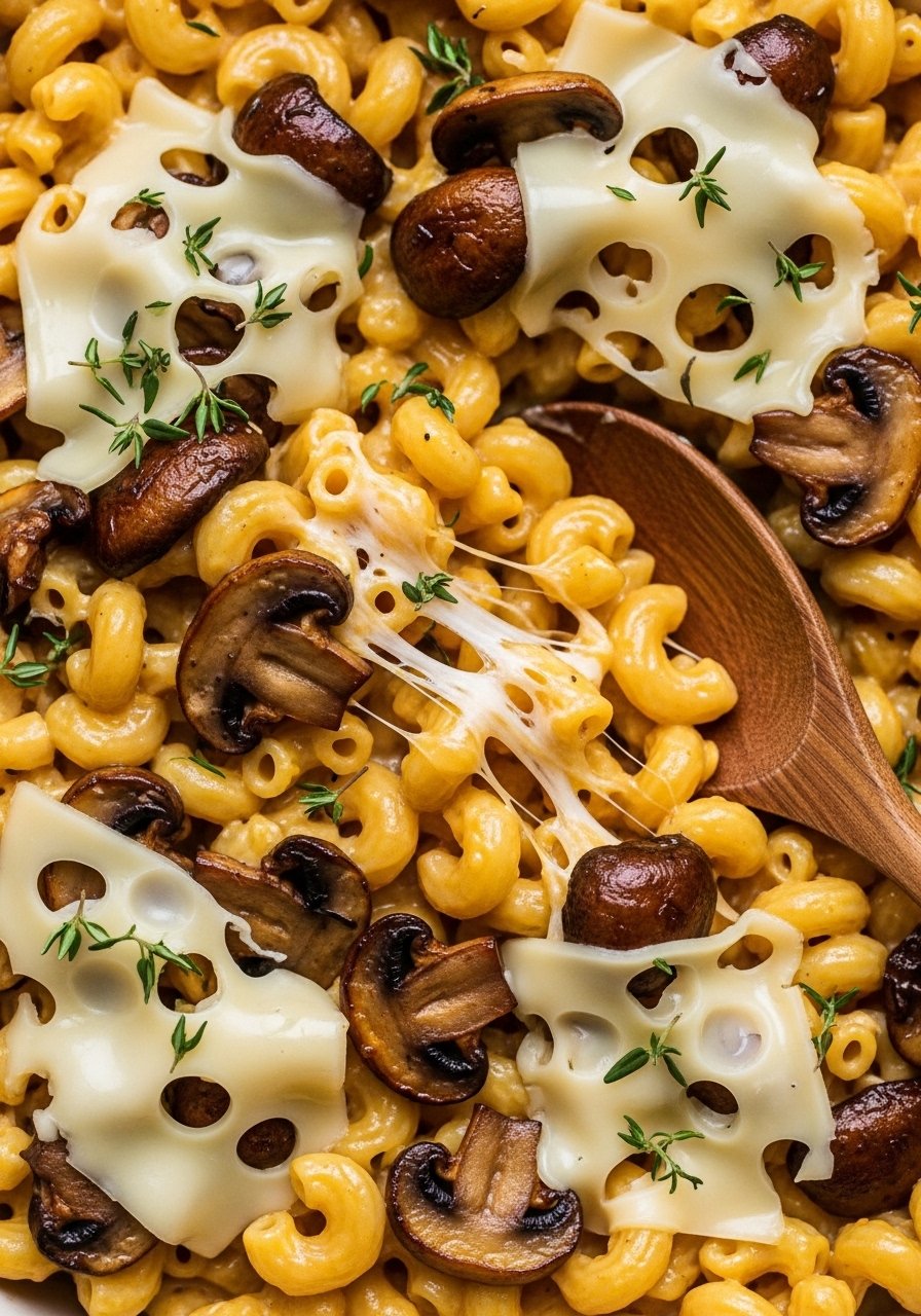 Swiss cheese adds nutty depth and pairs beautifully with deeply caramelized mushrooms for a savory, earthy mac. Use baby bella or cremini and a wooden spatula for sautéing.