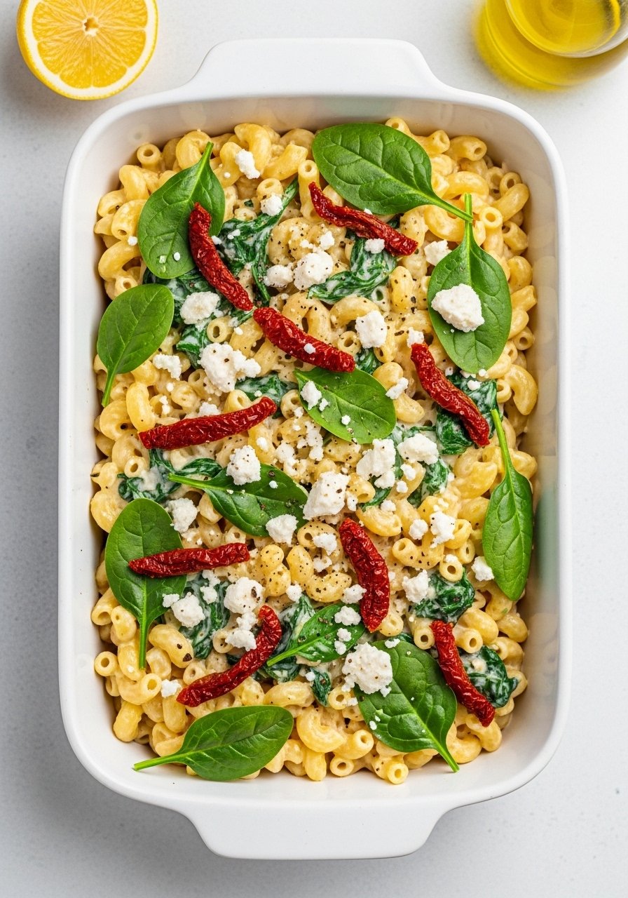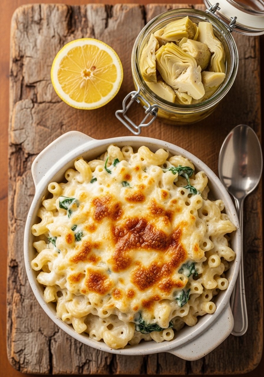 4. Fold pasta, spinach, and artichokes into sauce. Transfer to baking dish.