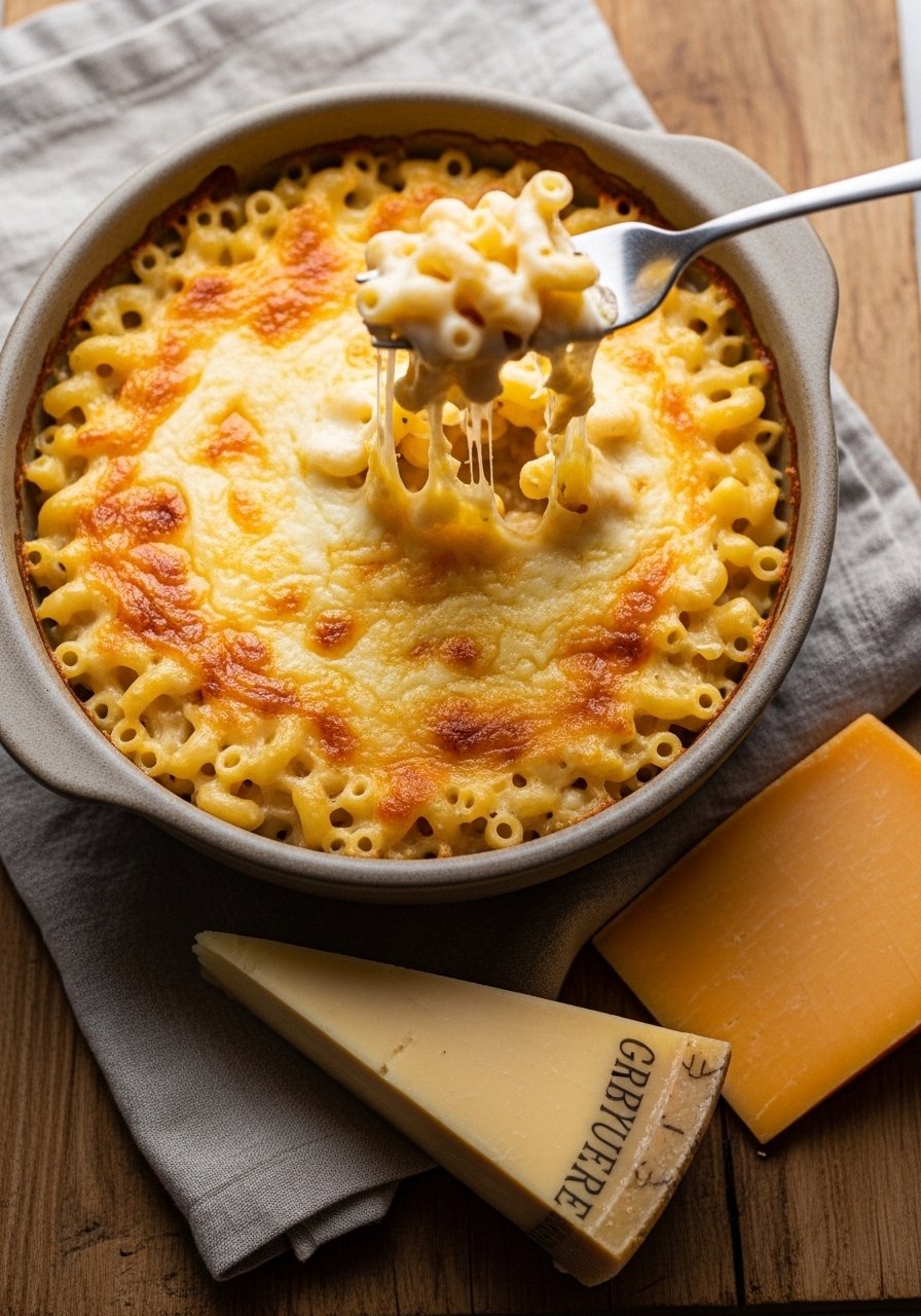 This one layers cheddar, Monterey Jack, Gruyère, and fontina for a luxe, melty sauce with complex flavor. It’s cream-forward but still sliceable thanks to a classic roux and the right cheese combo—nutty, tangy, and silky. Ideal for cheese-lovers who want a richer baked mac and cheese recipe.