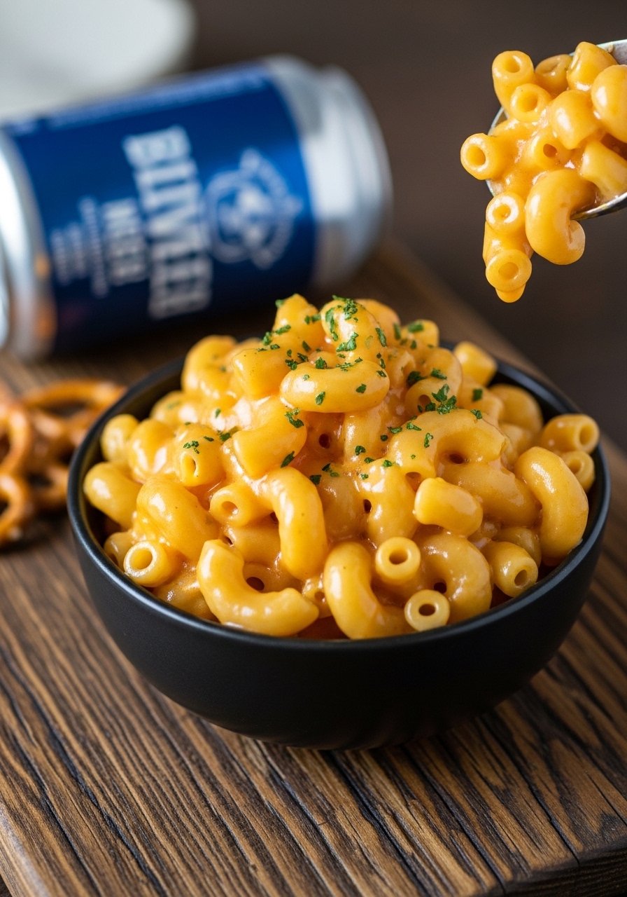 A splash of beer adds malty complexity to cheddar sauce, creating a pub-style mac and cheese that’s both comforting and flavorful. Use a lager or amber for best balance.