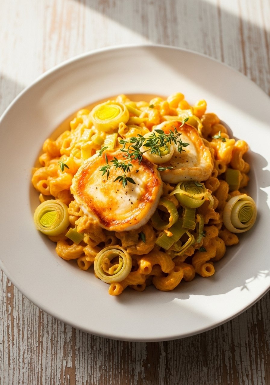 Tangy goat cheese and mellow sautéed leeks create a savory, elegant mac that’s both creamy and herb-forward. It’s a slightly lighter, aromatic option for dinner when you want something special.