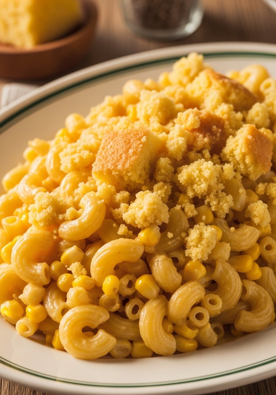 Southern-style cornbread crumbs add a sweet, crumbly top—great with smoked meats. Corn kernels in the mac add pop. Bake cornbread ahead using a cast iron skillet for crisp edges.