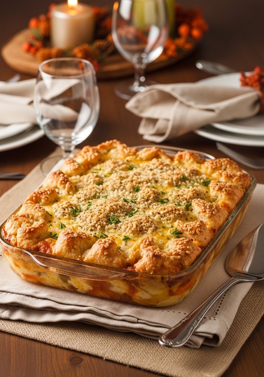 Scoop into warm bowls and garnish with chopped parsley. Pairs nicely with roasted turkey and a crisp green salad. Store leftovers in airtight containers for up to 4 days; reheat covered at 350°F until warmed. Make ahead: assemble and refrigerate; bake extra 5–10 minutes if chilled.
