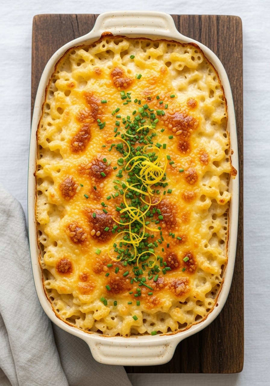 Garnish with chopped chives and extra lemon zest. Pair with a bright Sauvignon Blanc. Make ahead: assemble and refrigerate up to 24 hours, then bake covered 30–35 minutes from chilled. Store in airtight containers.