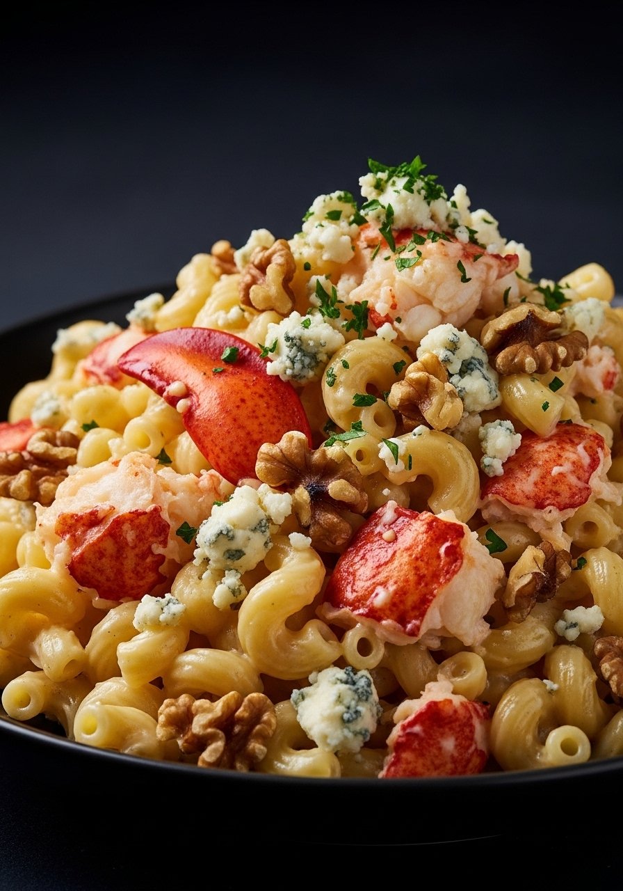 Bold blue cheese adds sharp tang that contrasts the sweet lobster—an adventurous choice for fans of intense flavors. Walnuts add crunch and earthiness.