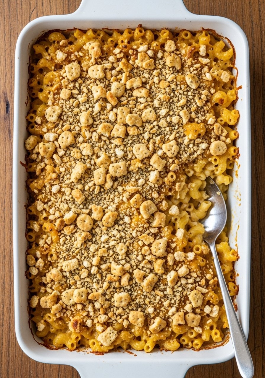 5. Mix crushed crackers with melted butter and press atop casserole.