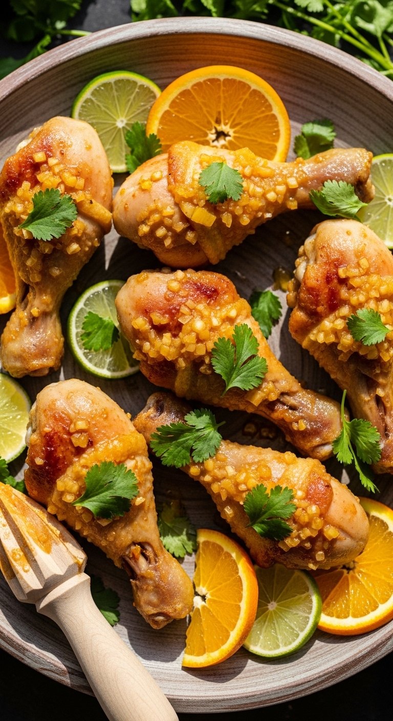 Citrus-forward mojo with lots of garlic and oregano makes drumsticks tangy and fragrant. The acidic marinade tenderizes and gives a bright finish—excellent for grilling.