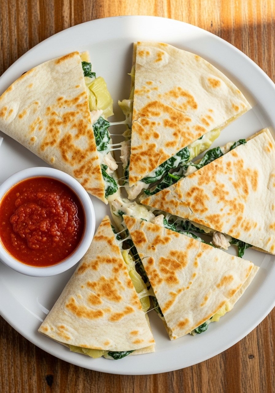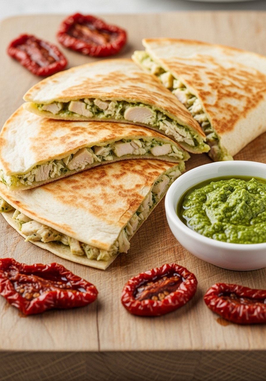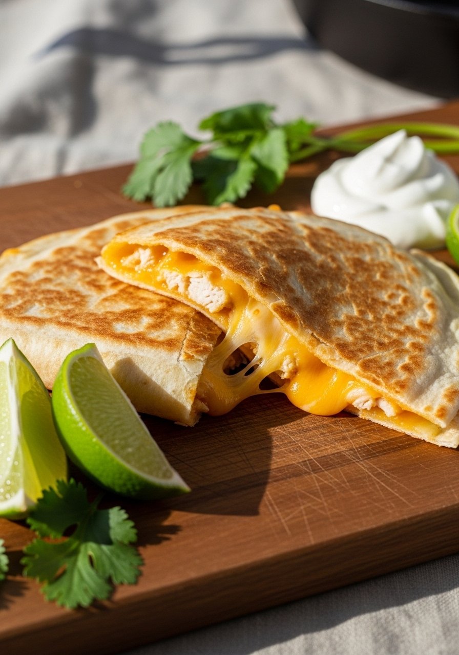 - Layer cheese and chicken on tortilla, fold, and cook 2–3 minutes per side until golden.