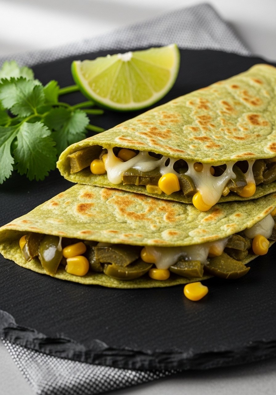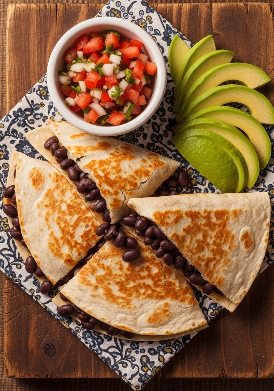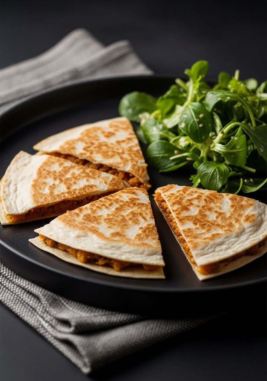 - Heat oil, assemble quesadilla, cook 2–3 minutes per side until golden.