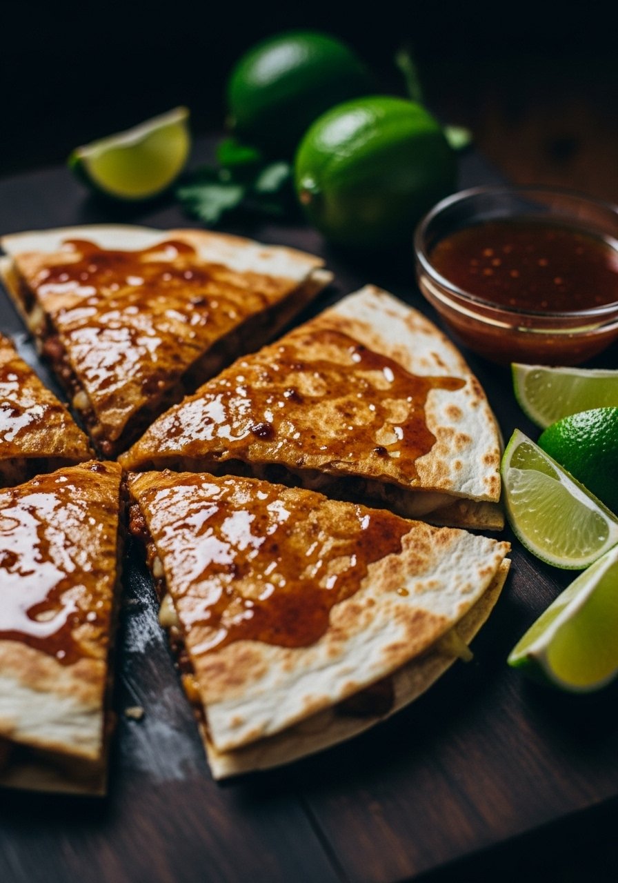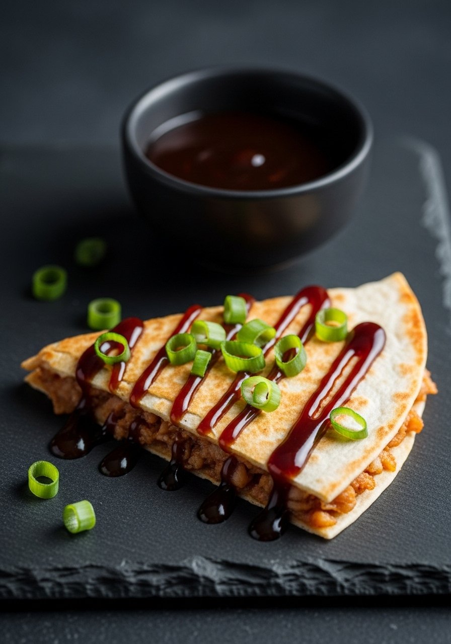 An Asian-inspired chicken quesadilla recipe uses teriyaki glaze, pineapple, and scallions for savory-sweet contrast. It’s an easy fusion twist that tastes like takeout. Use a silicone basting brush to glaze the tortilla edges.