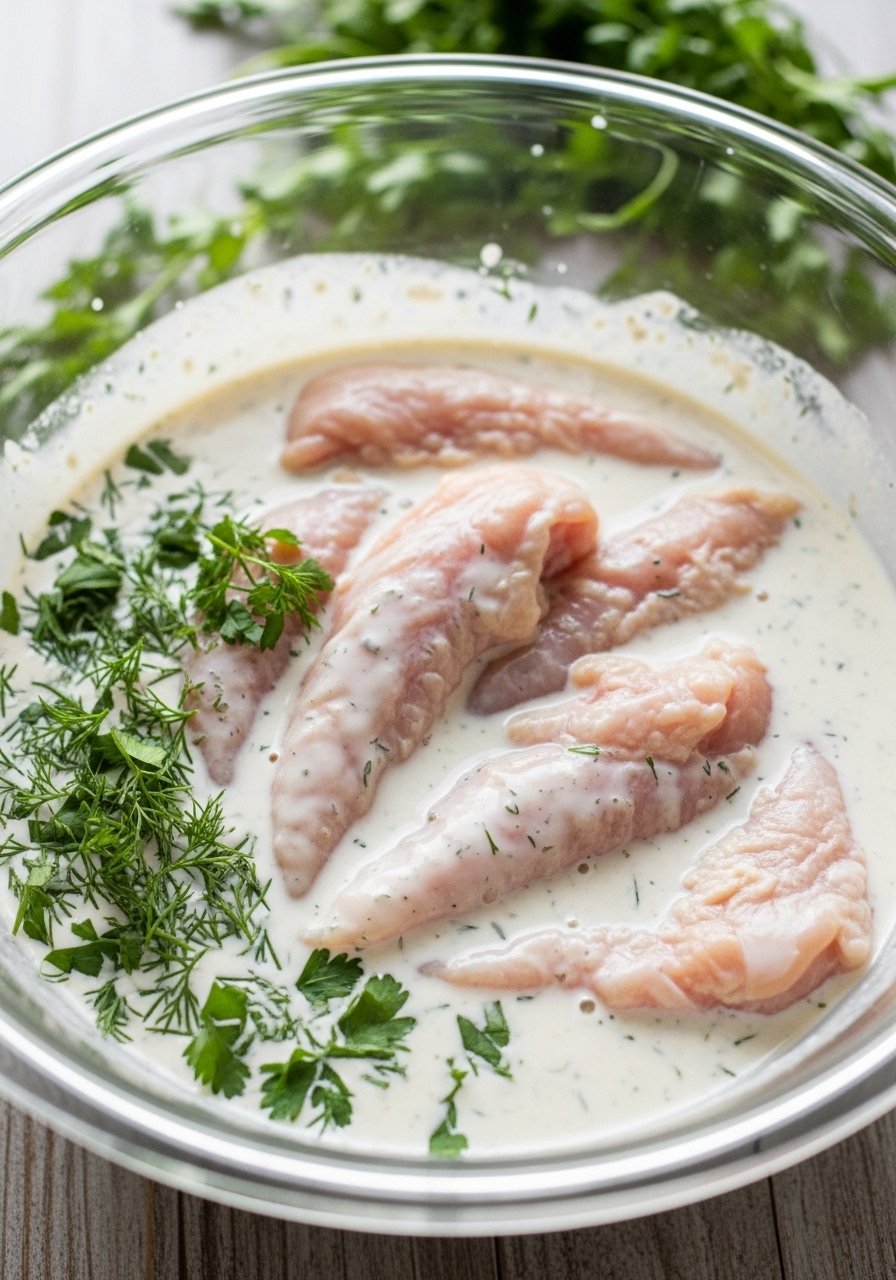 Buttermilk tenderizes while ranch seasoning adds tang and herbs. This marinade keeps chicken moist and gives a subtle tang—ideal before frying or air-frying.