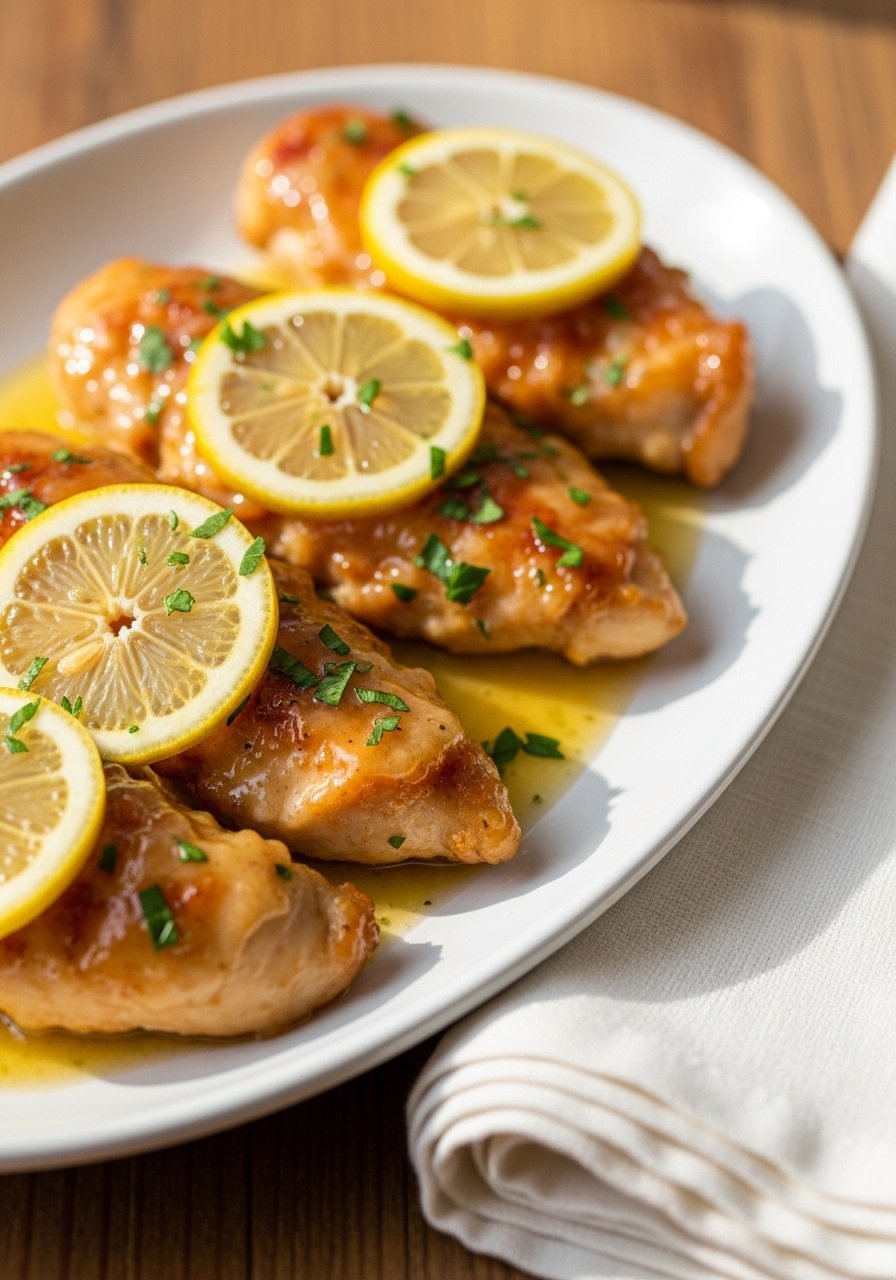 Serve on a warm platter with roasted potatoes and steamed green beans. Garnish with extra lemon slices and parsley. Store leftovers in airtight containers for up to 3 days; reheat gently in the skillet. This plate pairs nicely with a crisp white wine or iced tea.