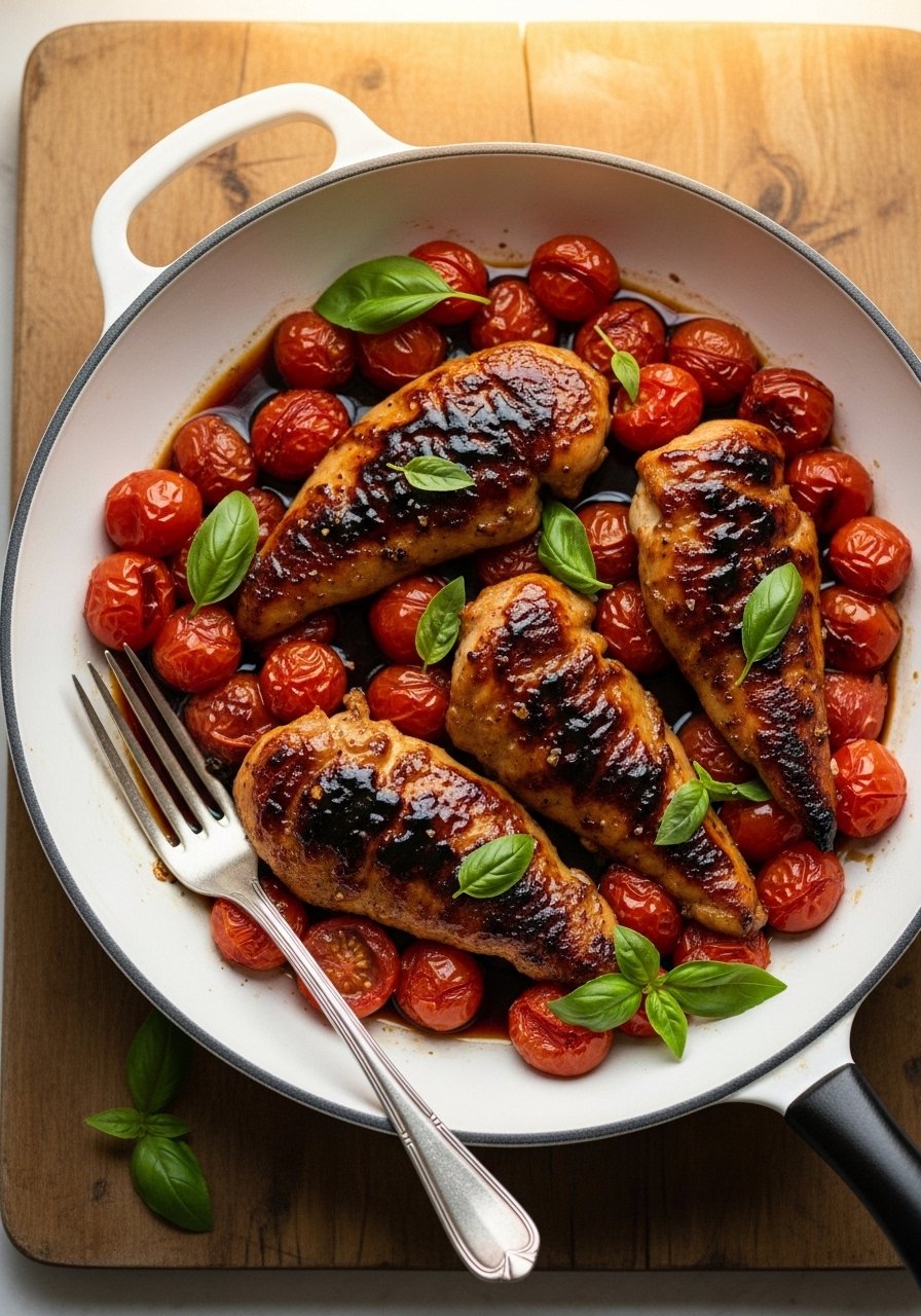 Tangy balsamic reduction and sweet tomatoes create a glossy, savory-sweet coating. The tomatoes burst and infuse the sauce, making each bite juicy and fragrant. This dish is elegant enough for guests yet simple enough for a weeknight.