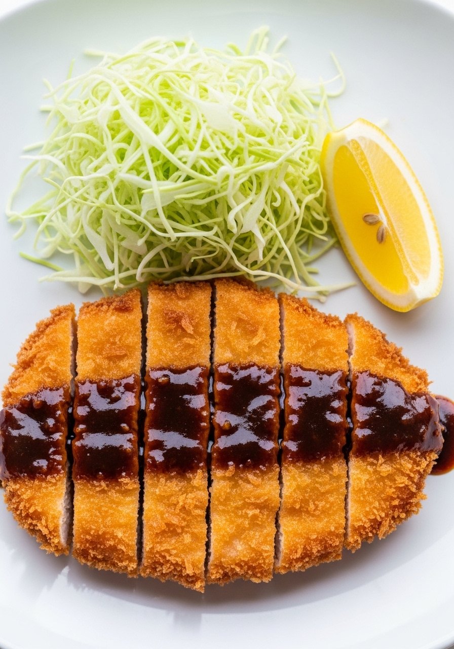 5. Slice and serve with tonkatsu sauce and shredded cabbage.