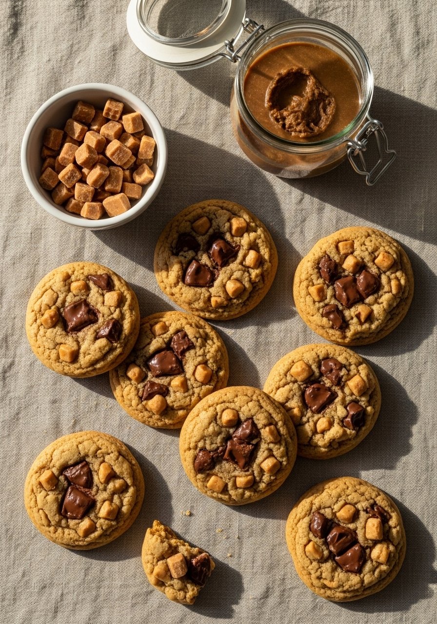 Toffee bits add crunchy caramel pockets that pair beautifully with brown butter. The cookies are chewy with small shards of toffee offering texture—perfect for a holiday tray or a weekend bake.