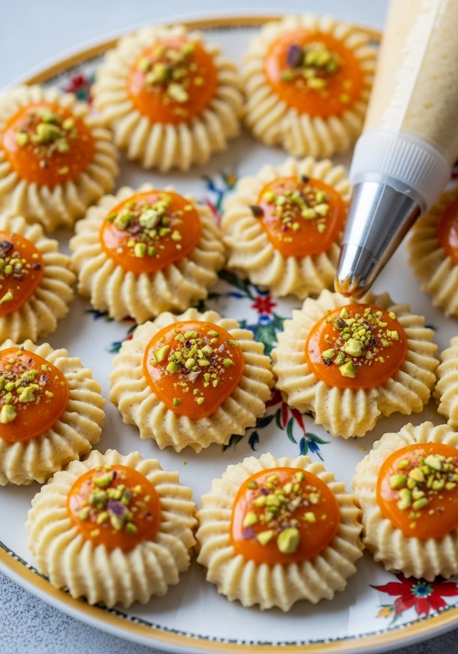 - Press/piped shapes onto lined sheet and bake 8–10 minutes until pale golden.