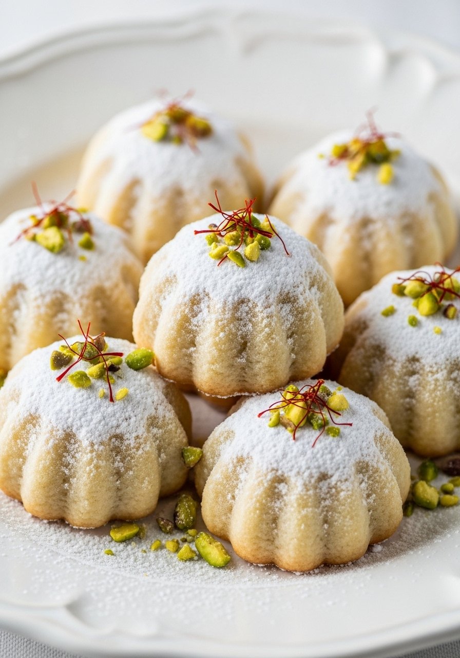Subtle saffron and crunchy pistachios make a refined shortbread that feels festive and exotic. Lightly dusted powdered sugar resembles fresh snow—perfect for upscale platters.