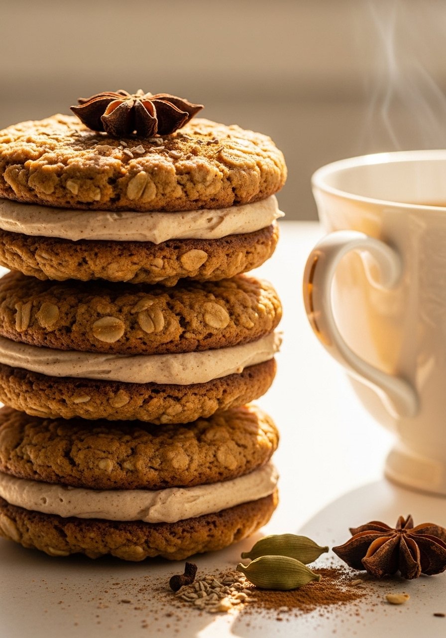 Oatmeal cookies infused with chai spices sandwich a silky vanilla cream—warm, aromatic, and comforting for winter tea service.