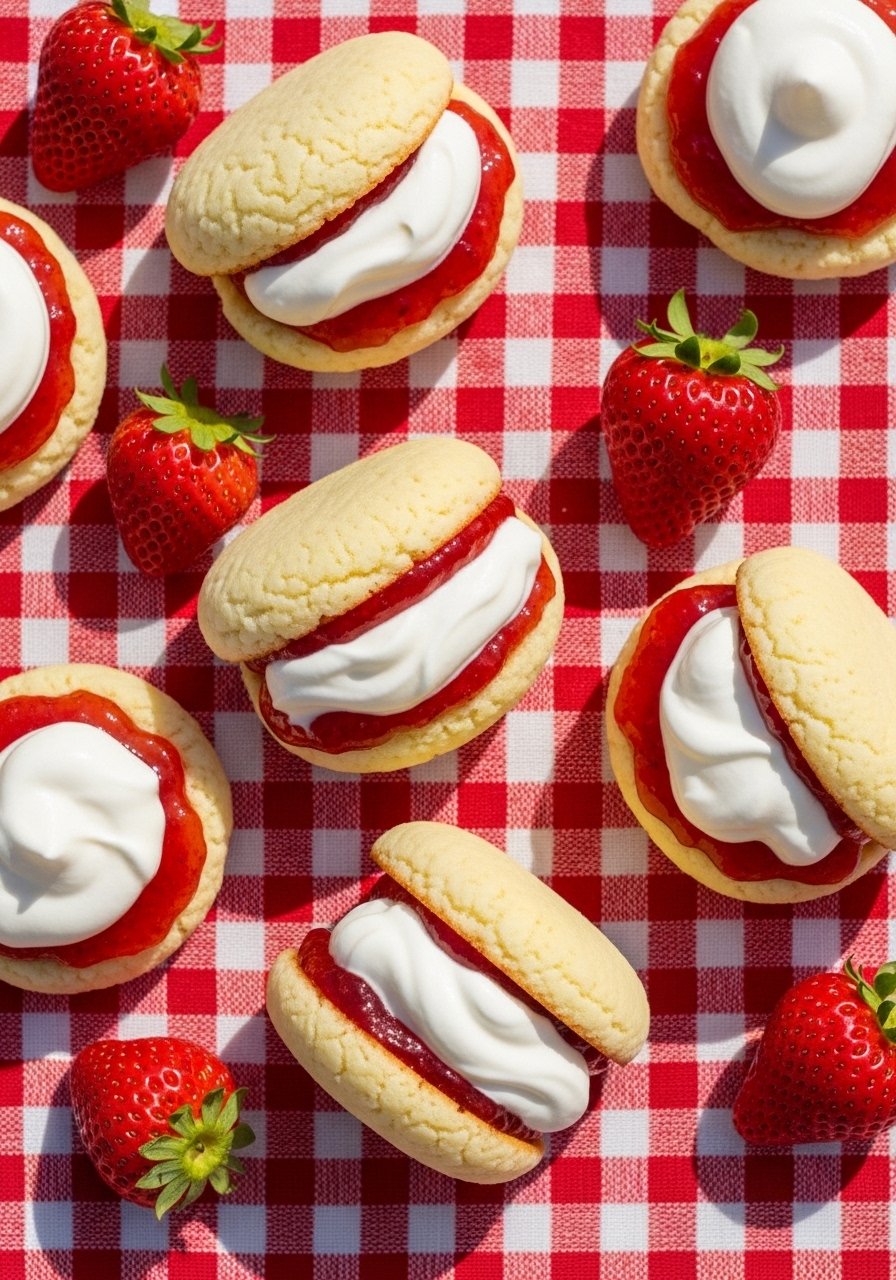 These strawberry shortcake cookies are a summer favorite—soft biscuit-like cookies sandwiched with jam and whipped cream or mascarpone. They’re light, fruity, and ideal for picnics.