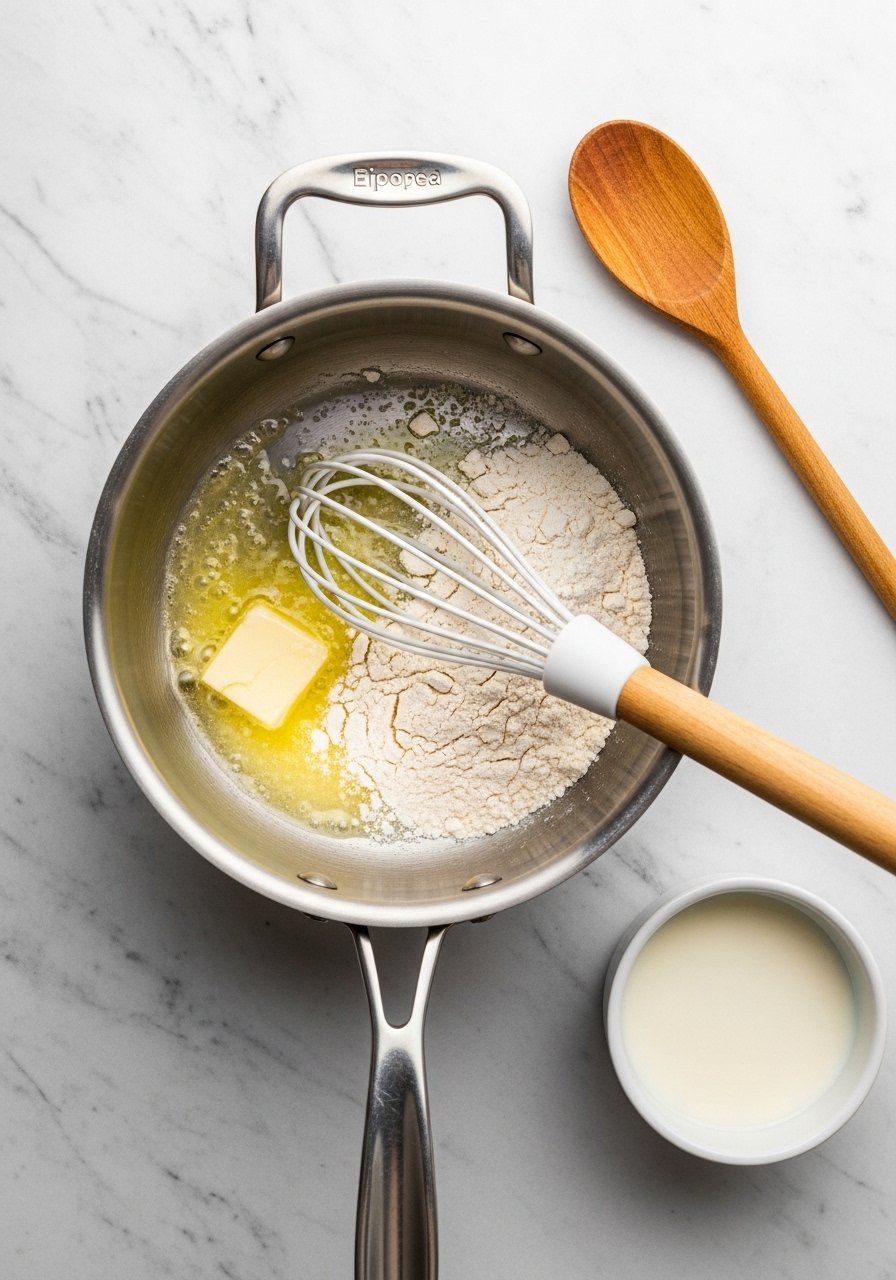 Use a medium non-stick saucepan over medium heat. Melt 4 tbsp butter, stir in 1/4 cup flour, and whisk constantly for 1–2 minutes until it's pale and bubbling.