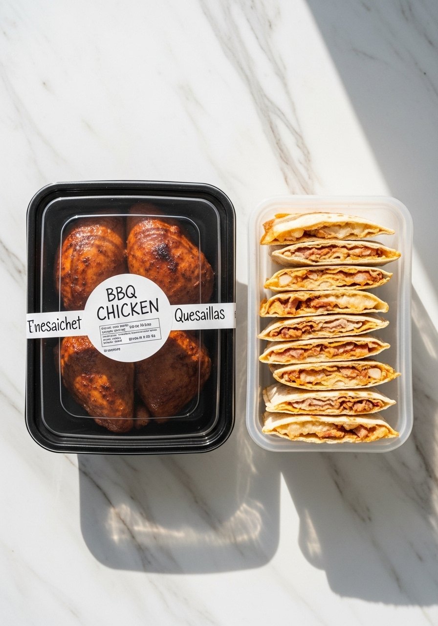 - Make a double batch of BBQ chicken and portion into airtight glass storage containers so you can assemble quesadillas in under 10 minutes all week.