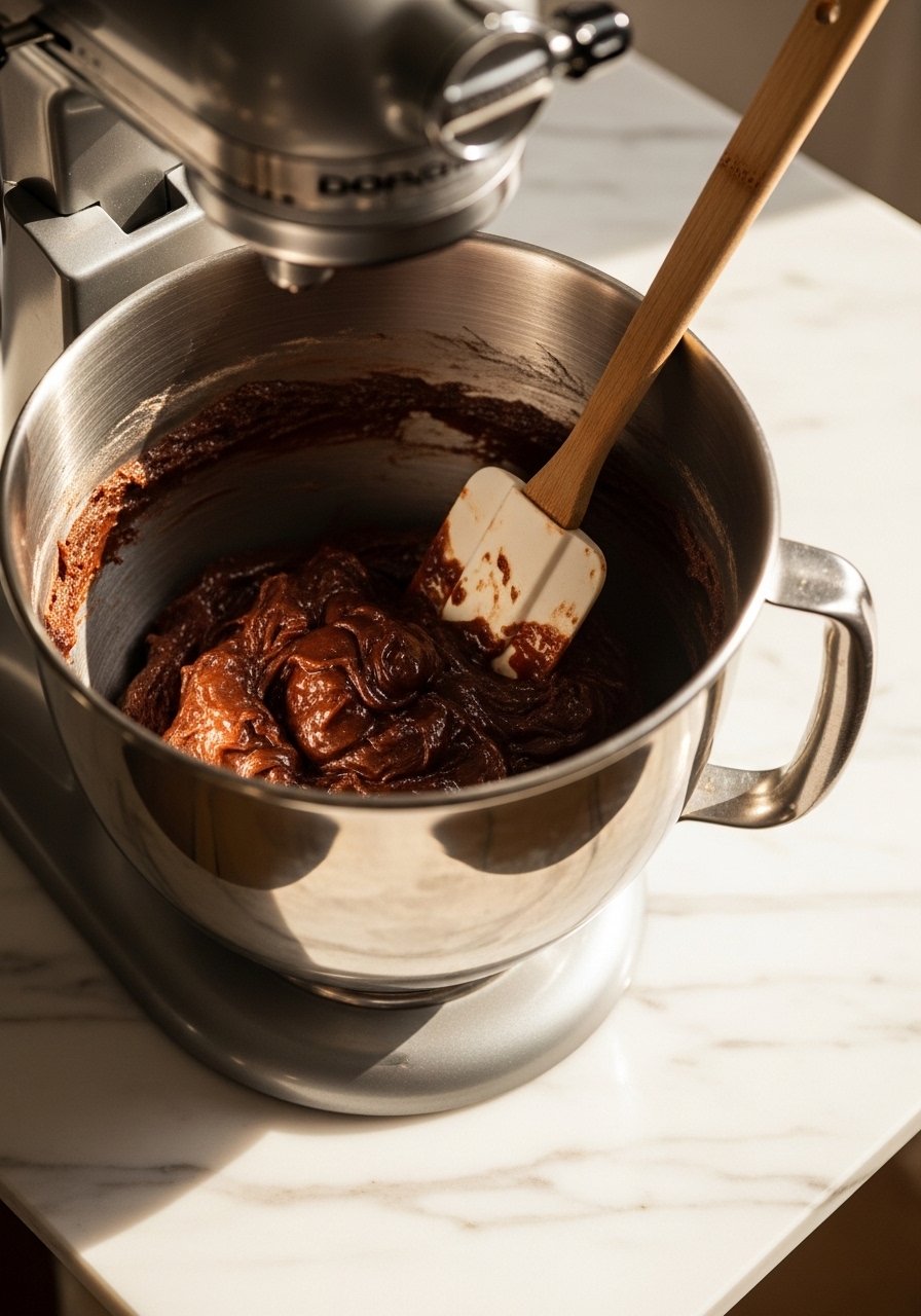 - Stir melted chocolate into the egg mixture, then fold in sifted flour, cocoa, and salt until just combined.