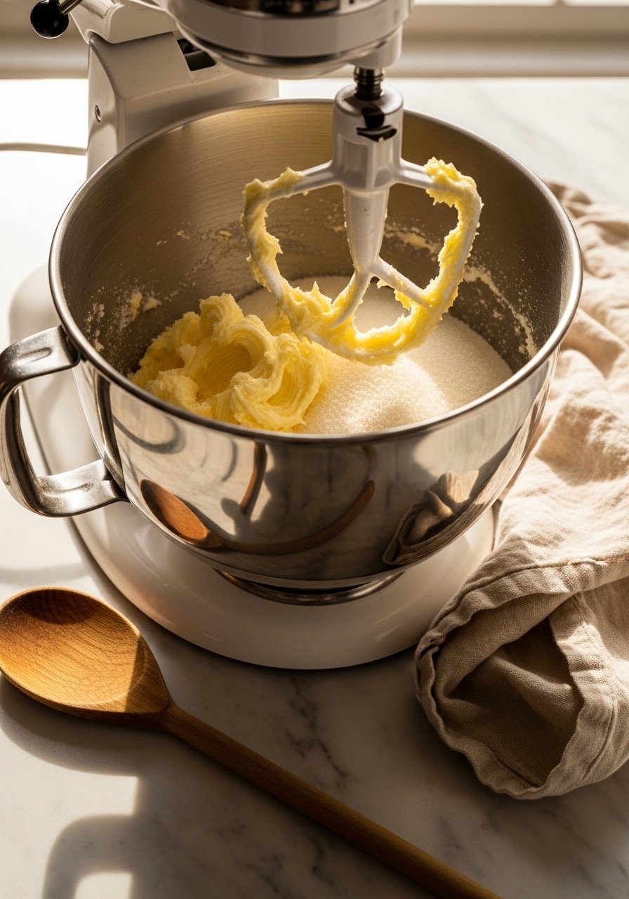 1. Cream butter and sugars (2–3 minutes).