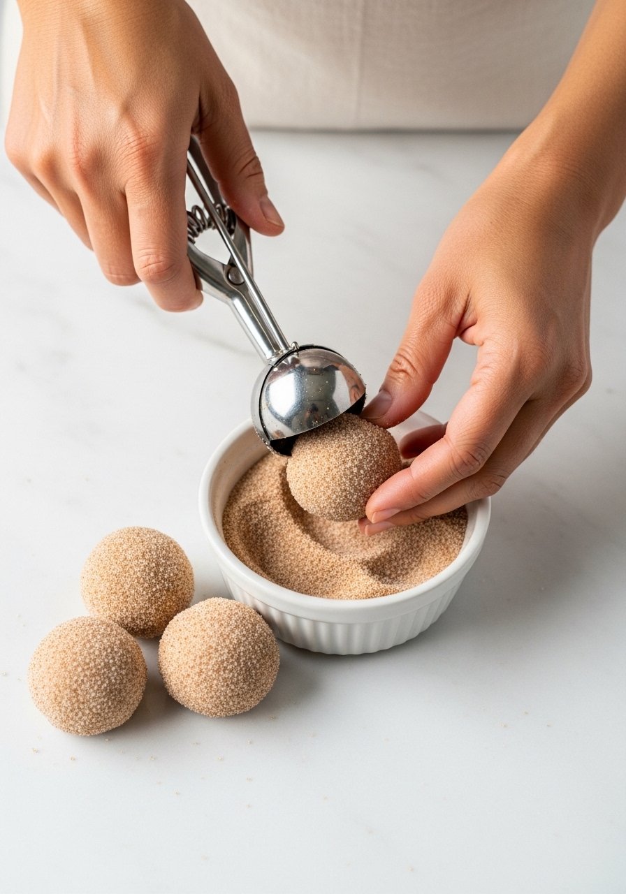 • Roll each ball in cinnamon sugar until fully coated.
