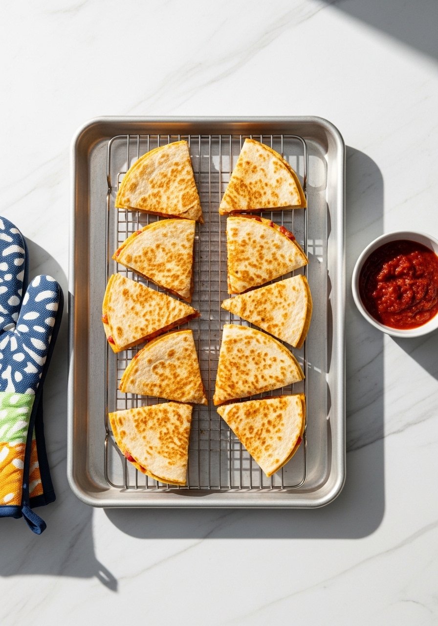 The trick is a hot oven, a raised wire rack for airflow, and a steady sheet pan. I use a rimmed baking sheet plus a wire rack for a baking sheet so every quesadilla crisps on both sides without flipping.