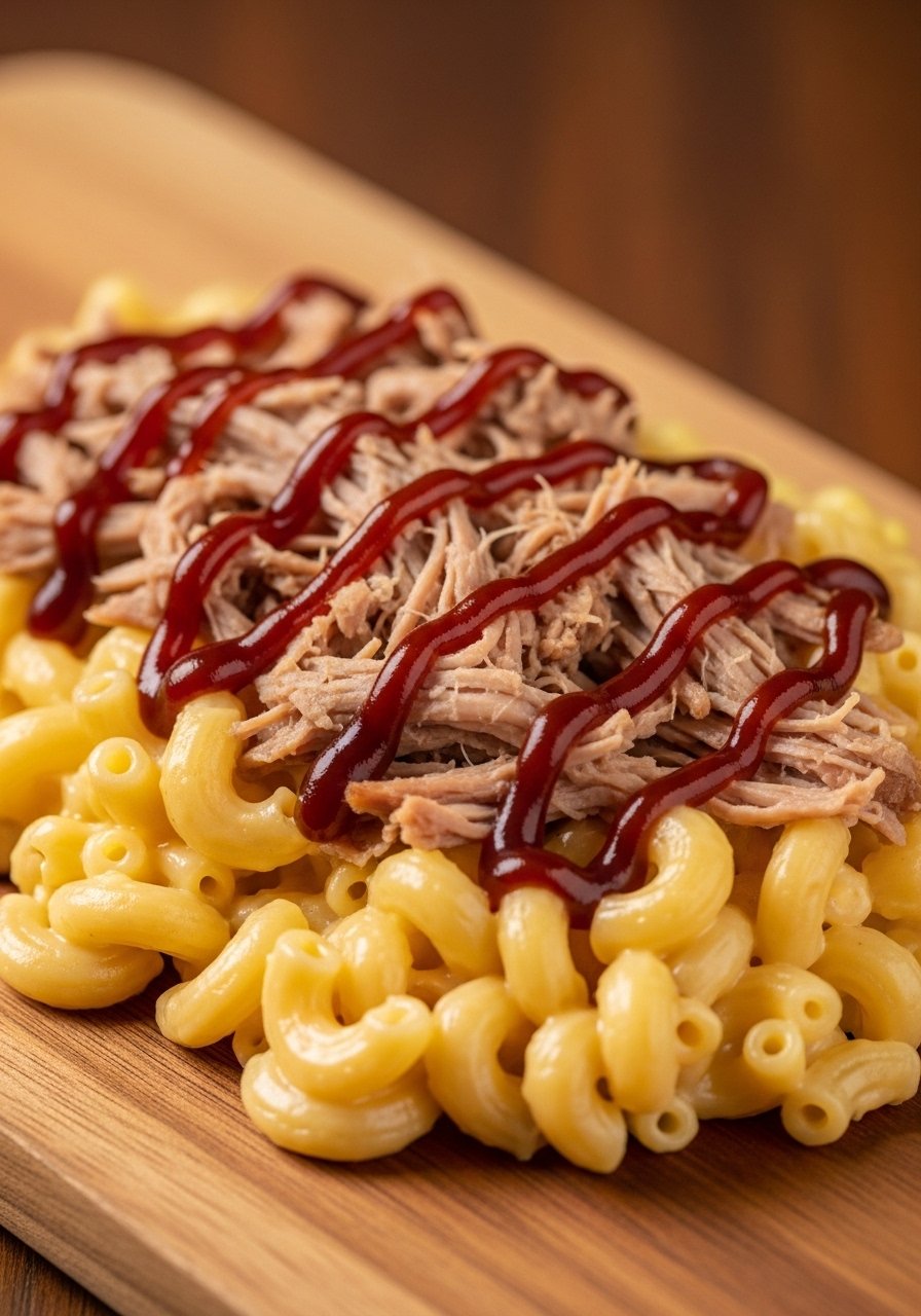 Combine tender pulled pork with sweet, mild BBQ for a hearty baked mac the whole family will enjoy. Keep the BBQ sauce mild or use a kid-friendly variety to avoid excessive tang.