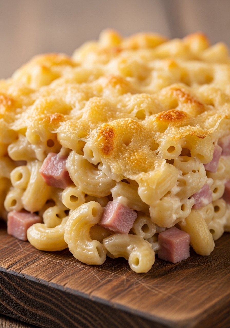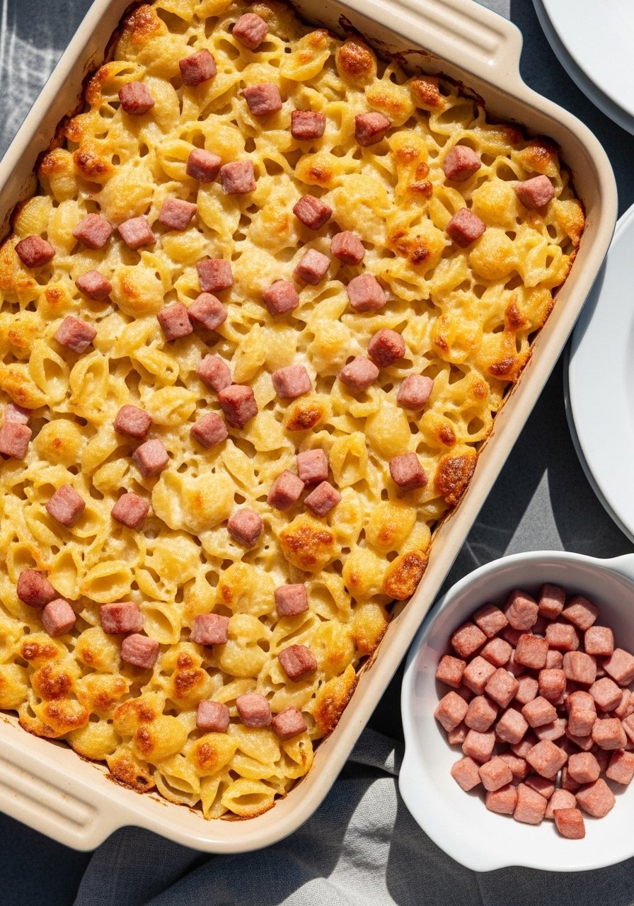 16. Ham & Mild Swiss Baked Mac (Comforting and Gentle)