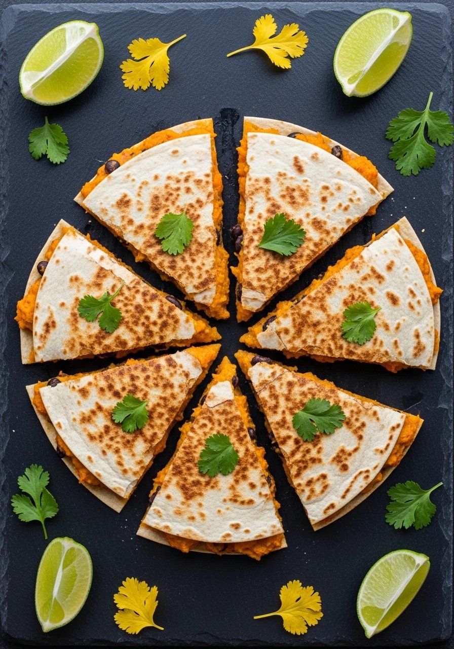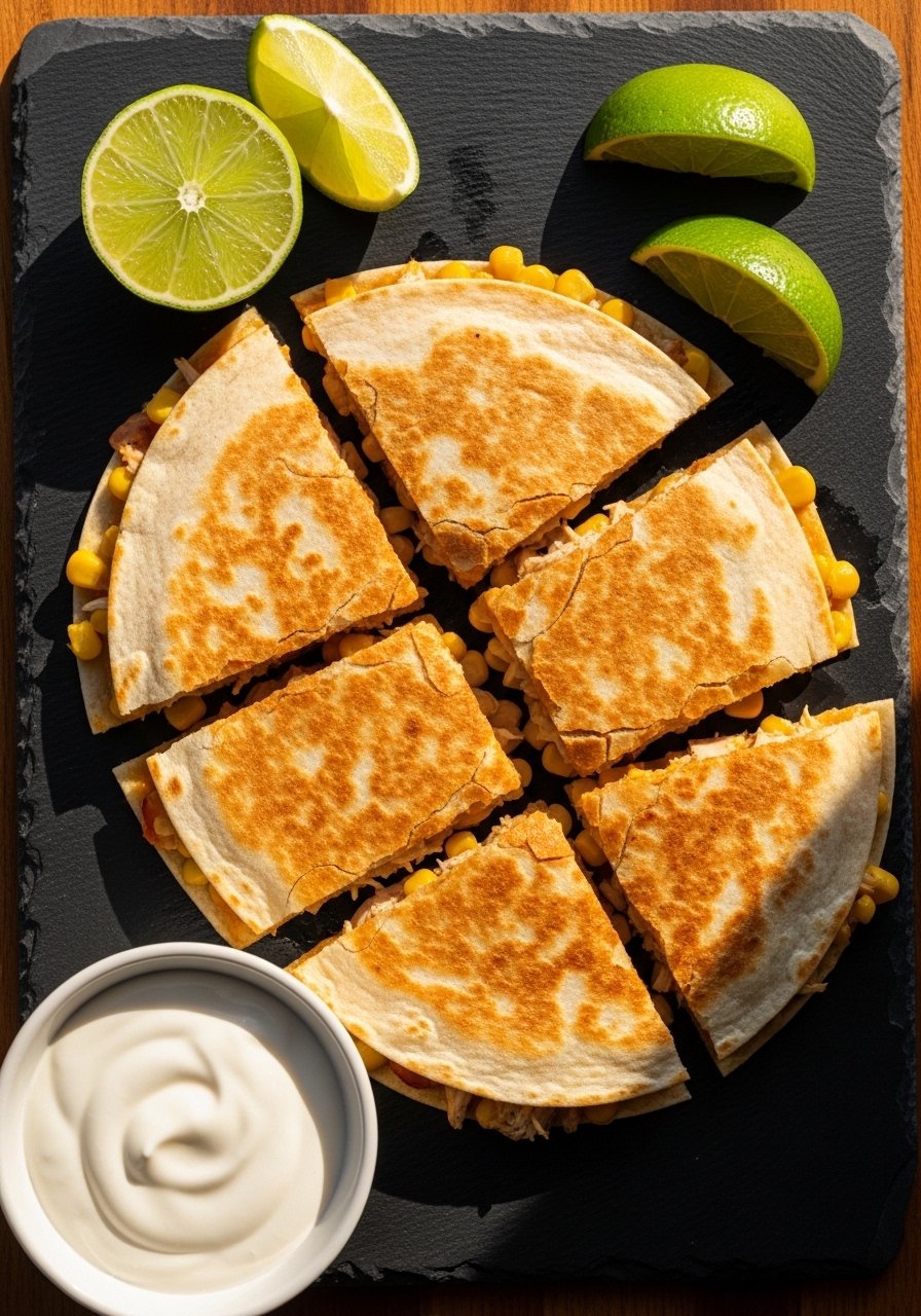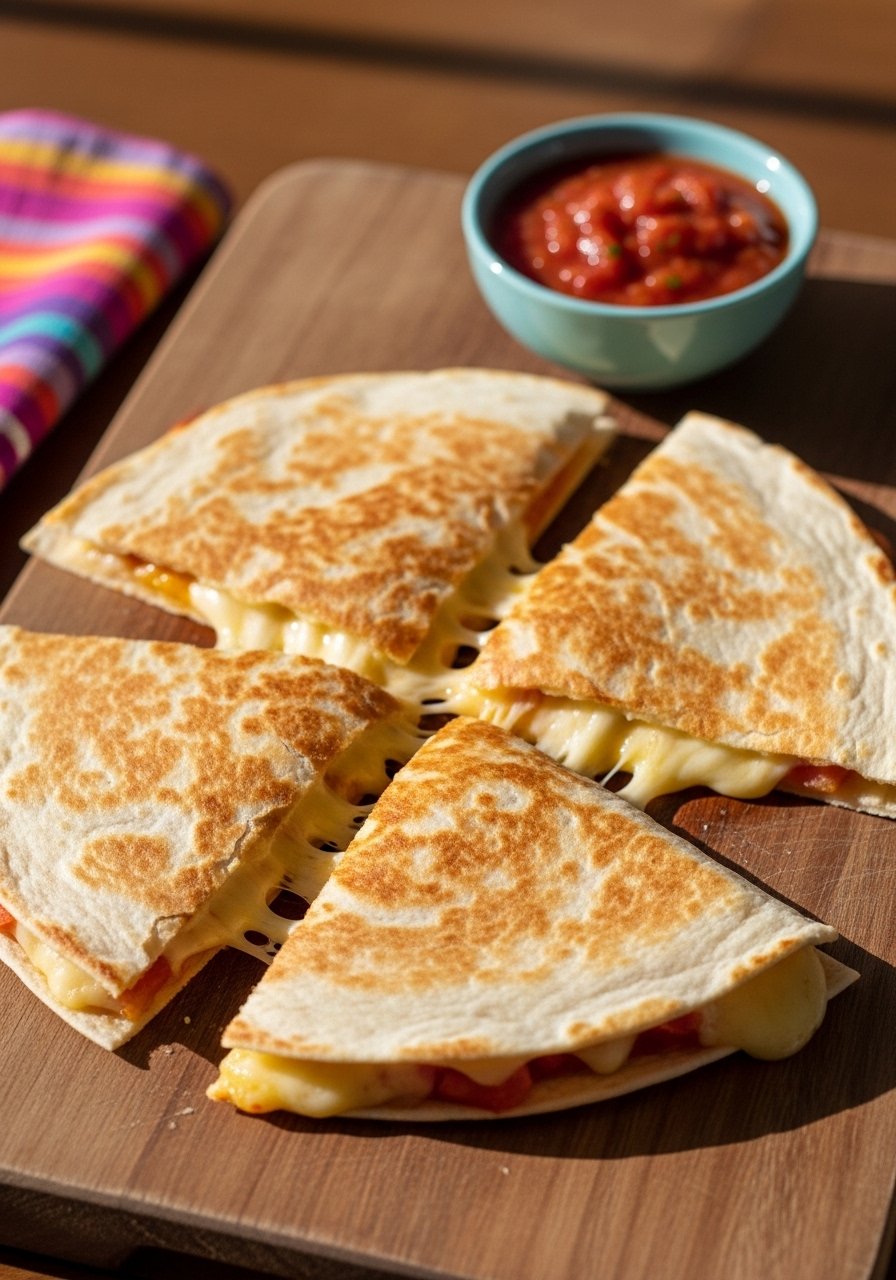 - Assemble quesadillas with cheese and optional filling; cook 2–3 minutes per side until golden.