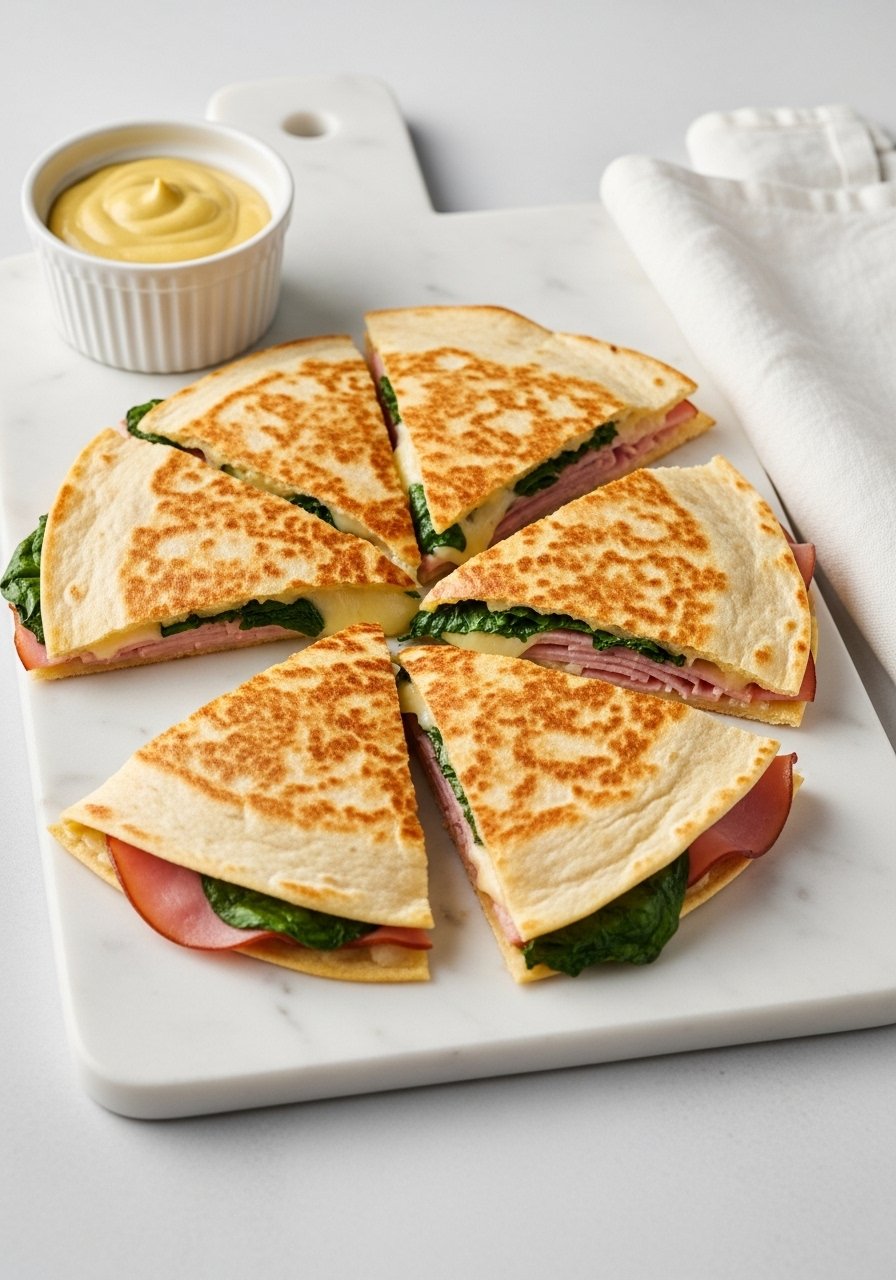 - Spread honey mustard on half of tortilla, add 1/2 cup cheddar, ham, apple slices, more cheese, fold.