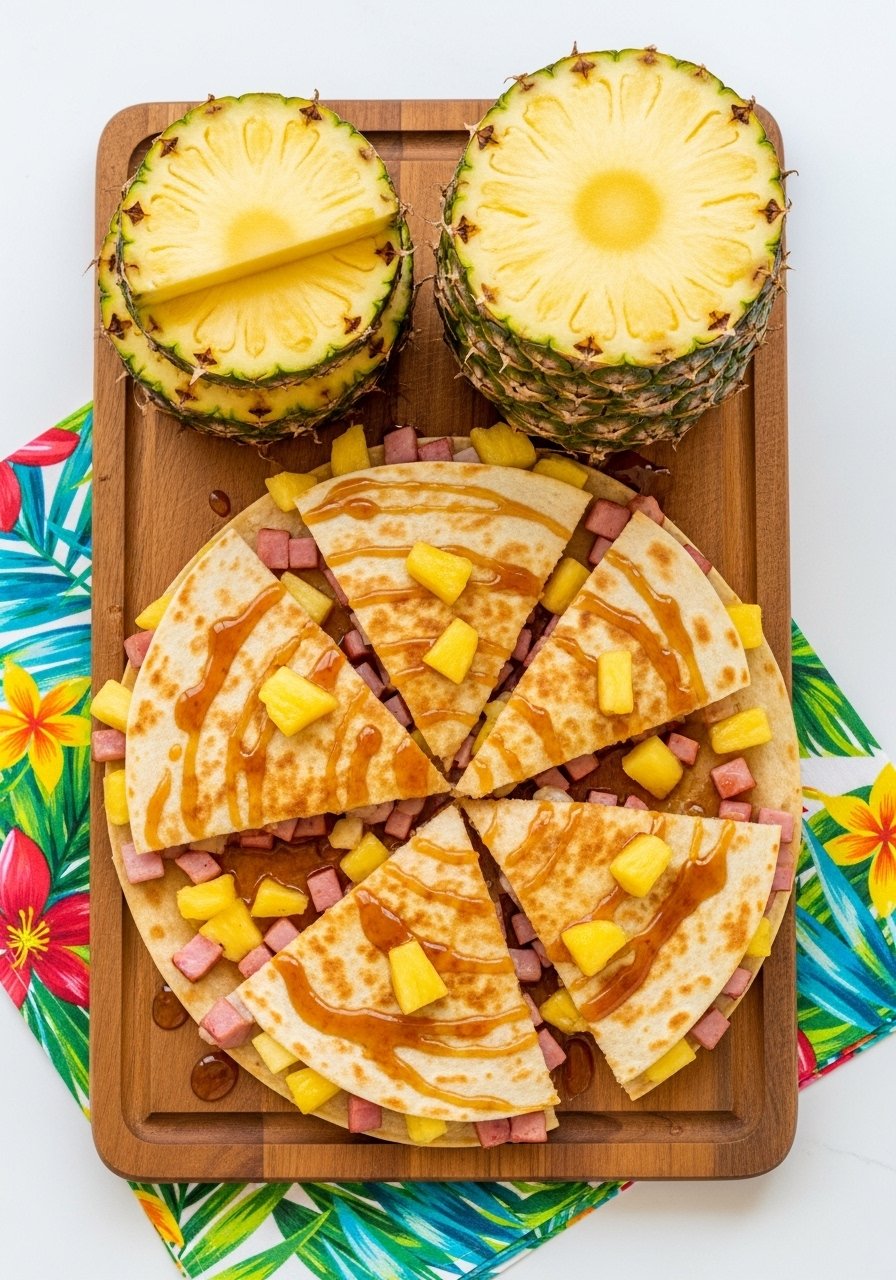 - Place tortilla, add 1/2 cup cheese, ham-pineapple mix, more cheese, fold.