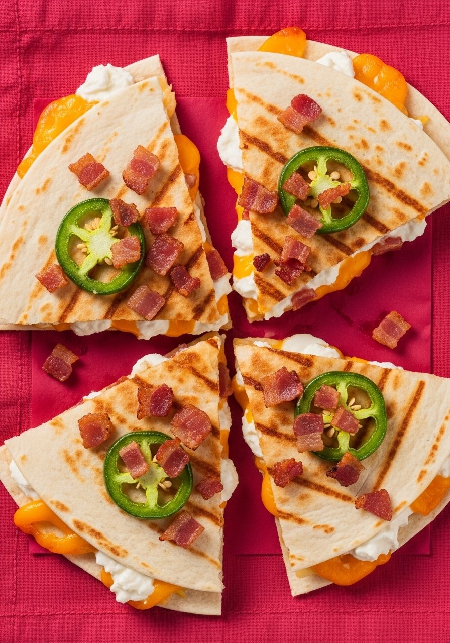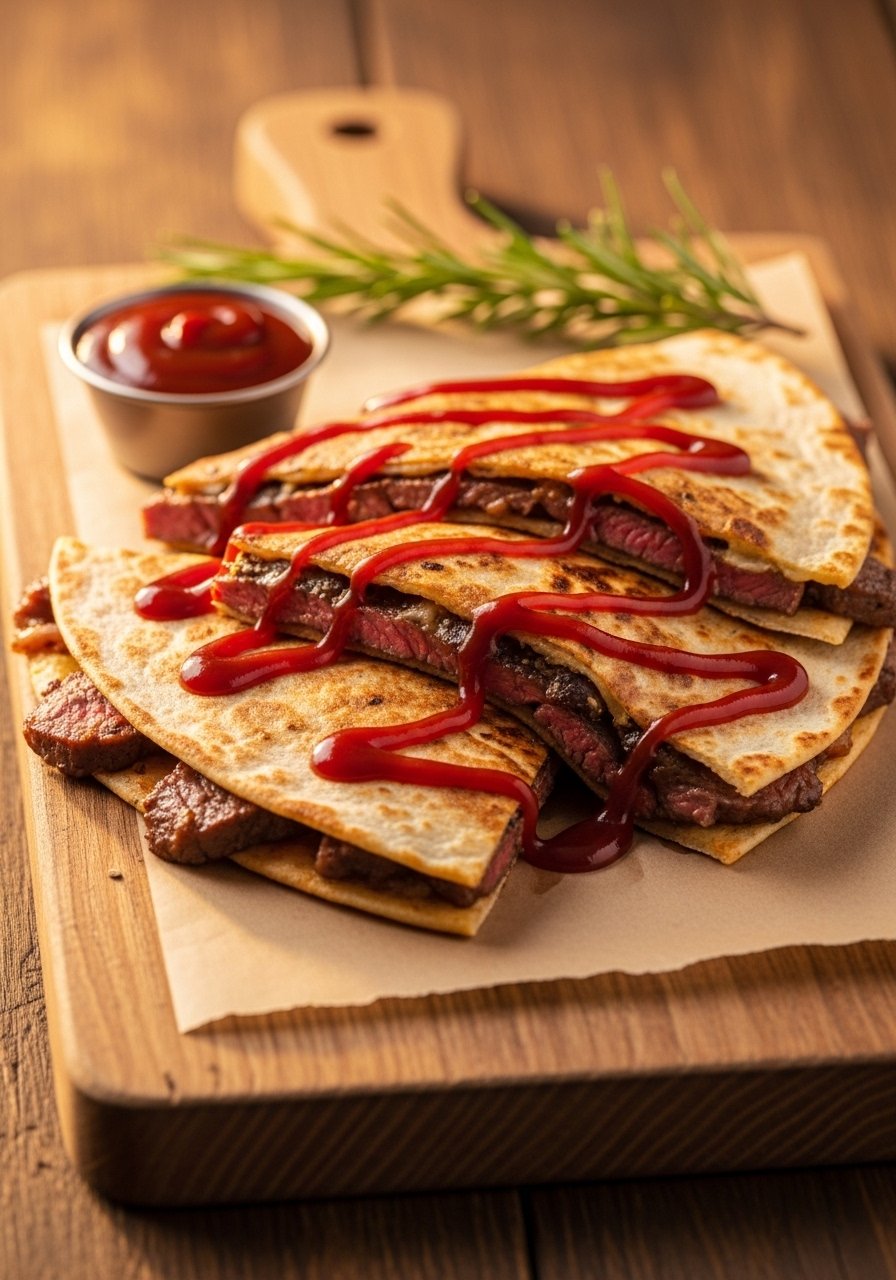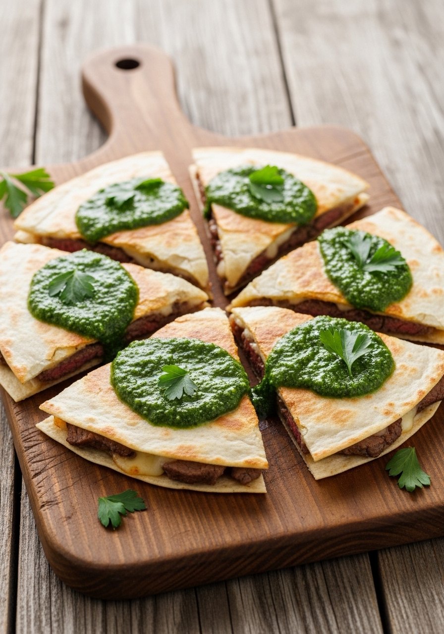 Fresh chimichurri adds herbal brightness and a little heat to a meaty quesadilla. The parsley-garlic sauce balances the rich steak and melted cheese, creating a lively, herb-forward bite. Fans of Argentinian flavors will love this twist.