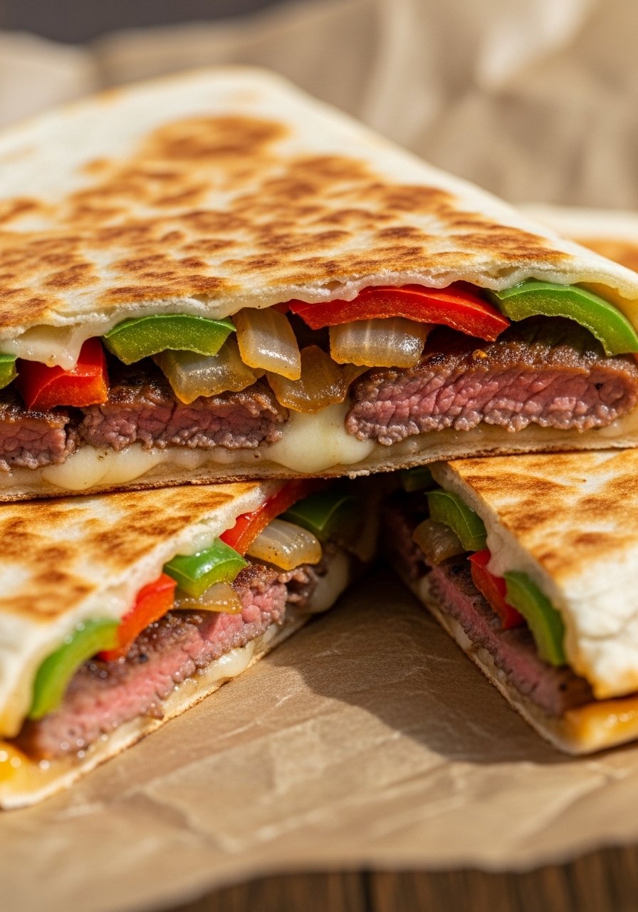 This mash-up replaces hoagie bread with crisp tortillas. Sweet sautéed onions and peppers with provolone create a melty, savory filling reminiscent of the classic sandwich. It’s comfort food with a crispy twist.
