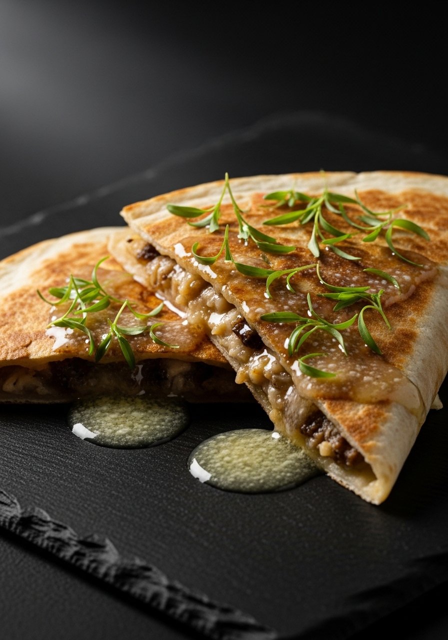 Rich blue cheese and sweet caramelized onions take the steak quesadilla in a sophisticated direction. The creamy, tangy cheese cuts through the meaty richness for a balanced bite. Great for dinner parties or date nights.