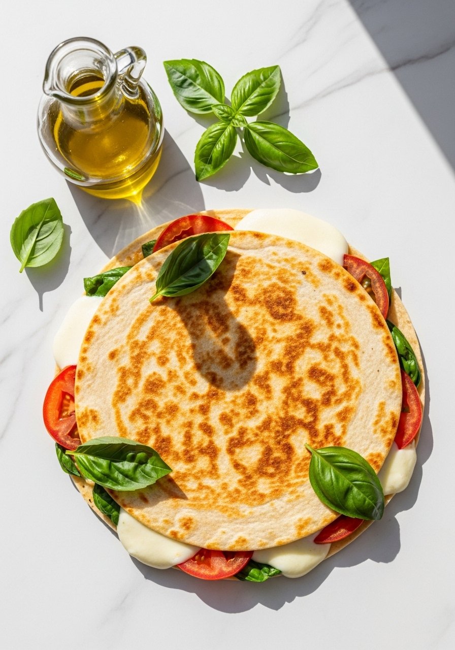 - Place tortilla in skillet, layer mozzarella, tomato slices, and basil.