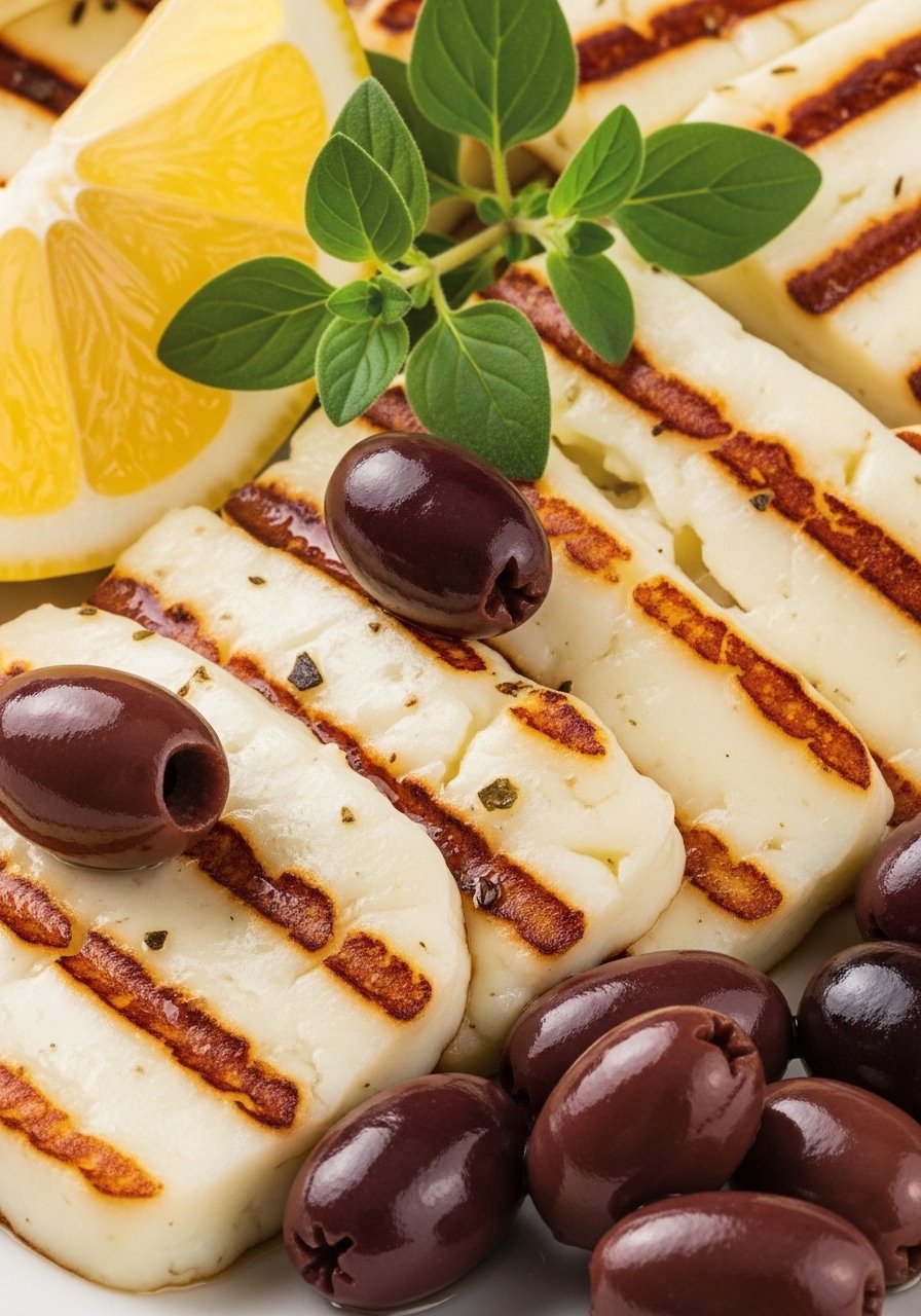 - Grill halloumi slices 2–3 minutes per side until golden.