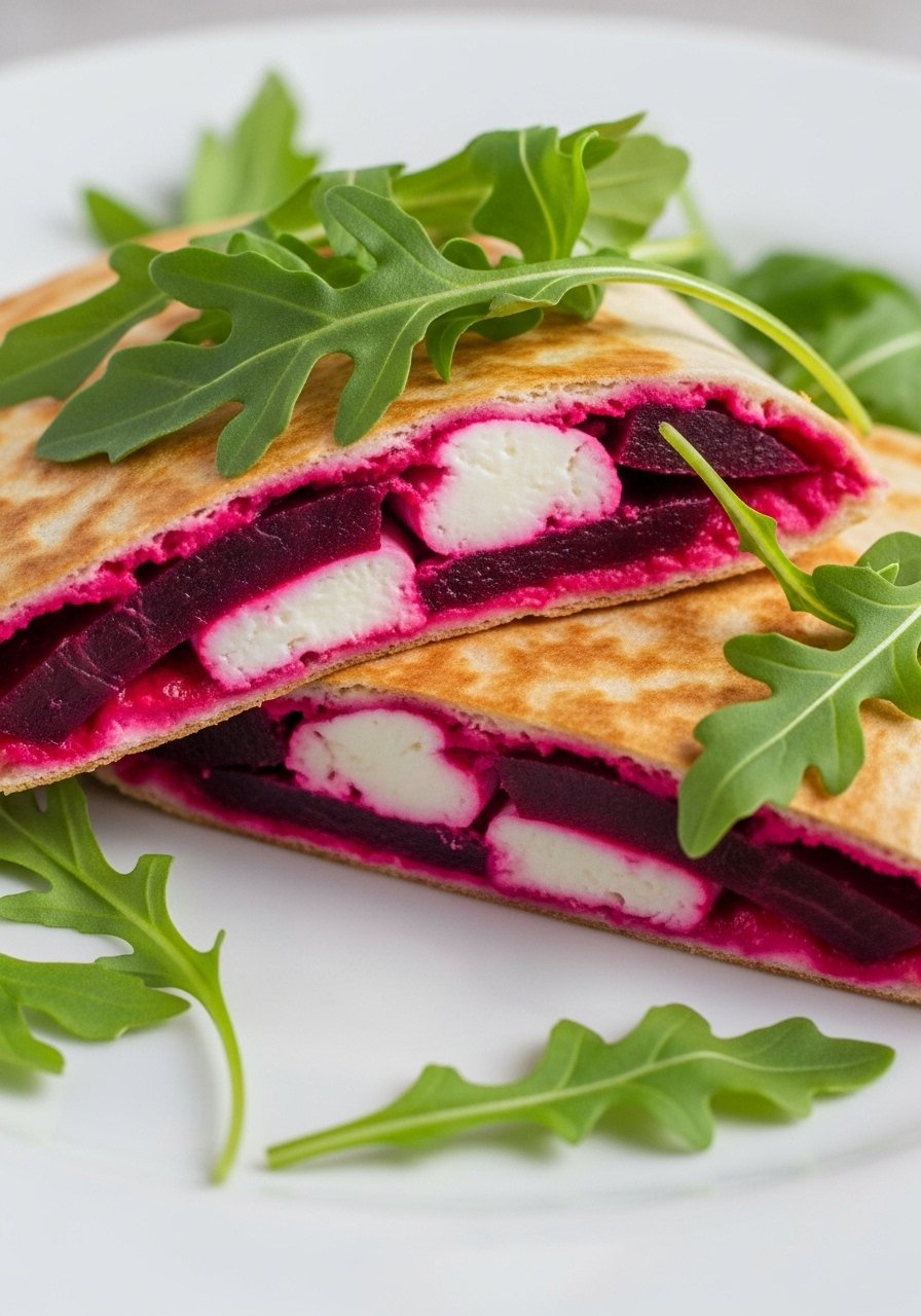 Earthy roasted beets and tangy goat cheese balanced by peppery arugula make this quesadilla vibrant and textural. It’s a colorful vegetarian option that looks as good as it tastes.
